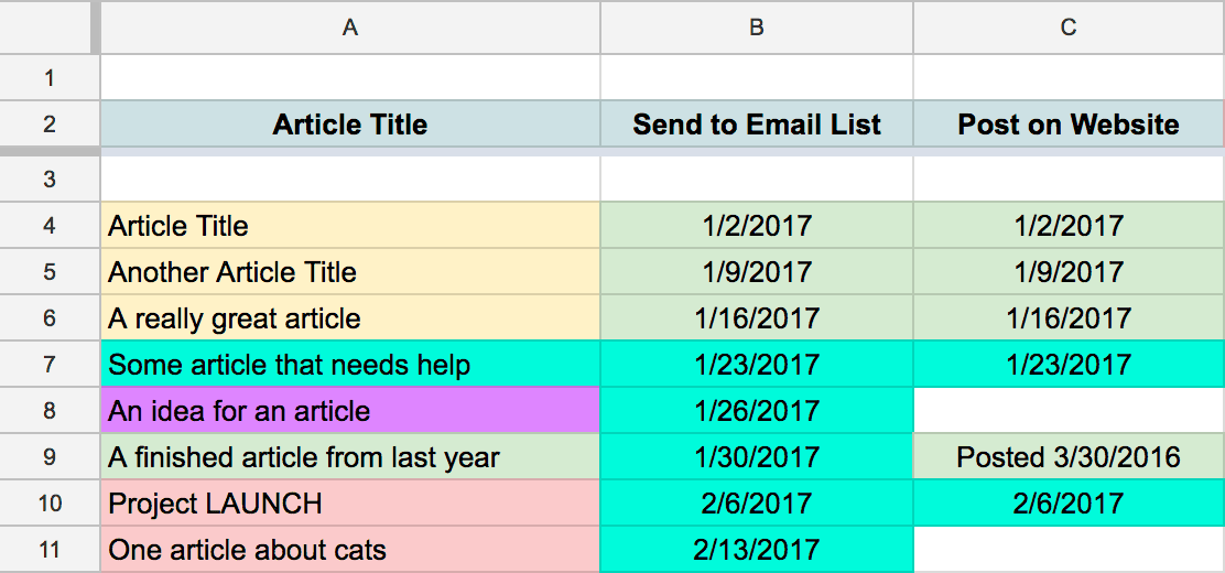 As far as a content calendar goes, I have a very simple Google Spreadsheet I’ve created. I use this on a weekly basis to schedule upcoming articles and keep track of previous articles. You can use my template by clicking here and making a copy (File > Make a copy…) or downloading that sheet as a PDF.
