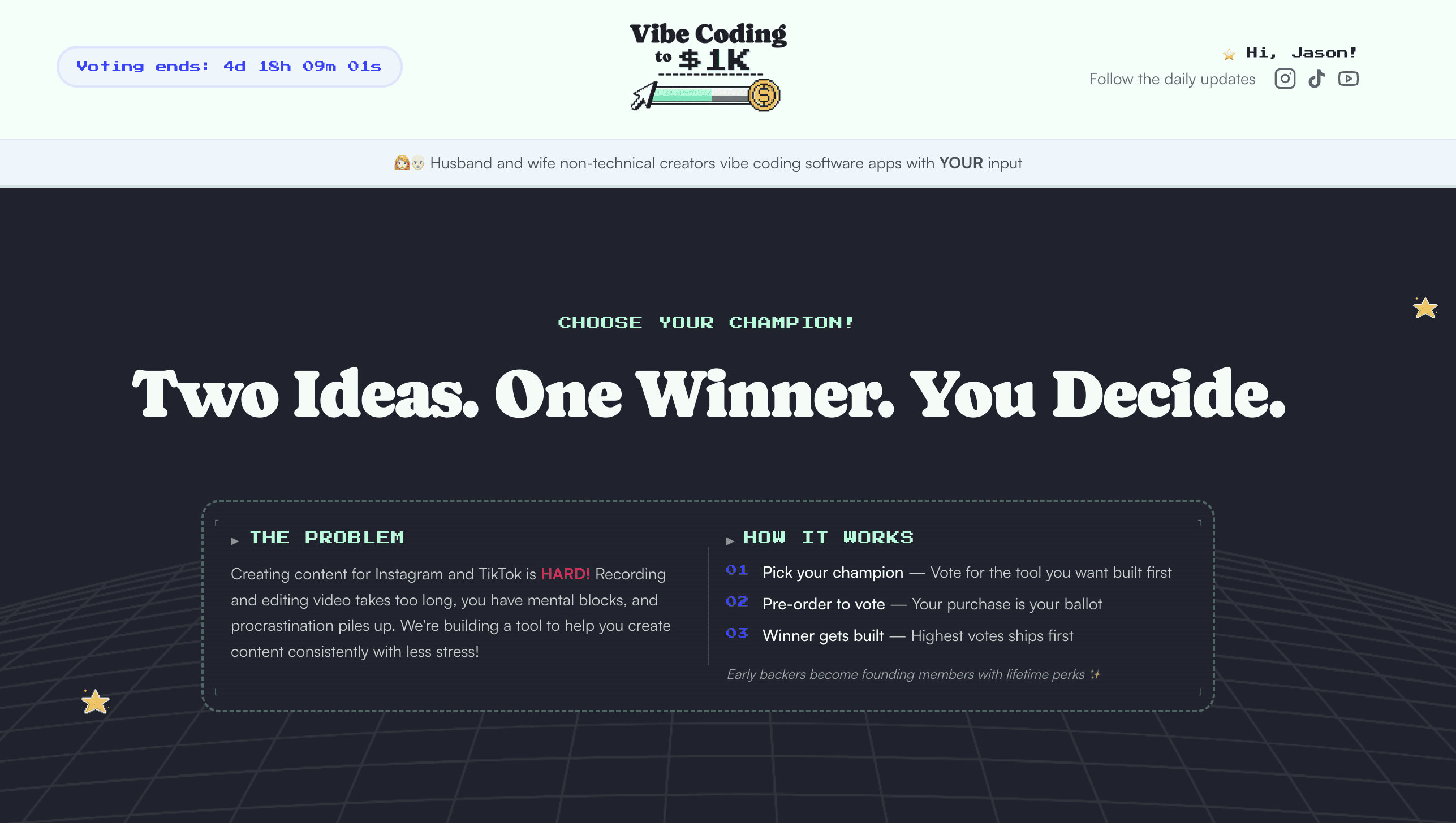 Our first experiment lives at VibeCoding.to, where our community is helping us vote on which ideas get built through pre-orders.