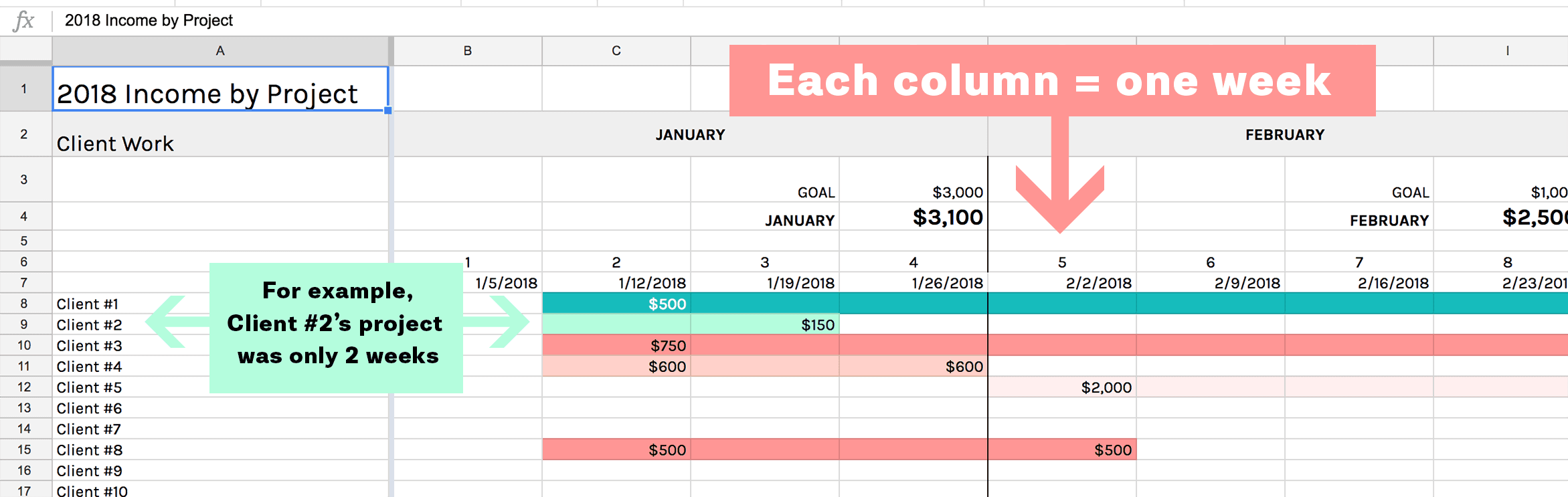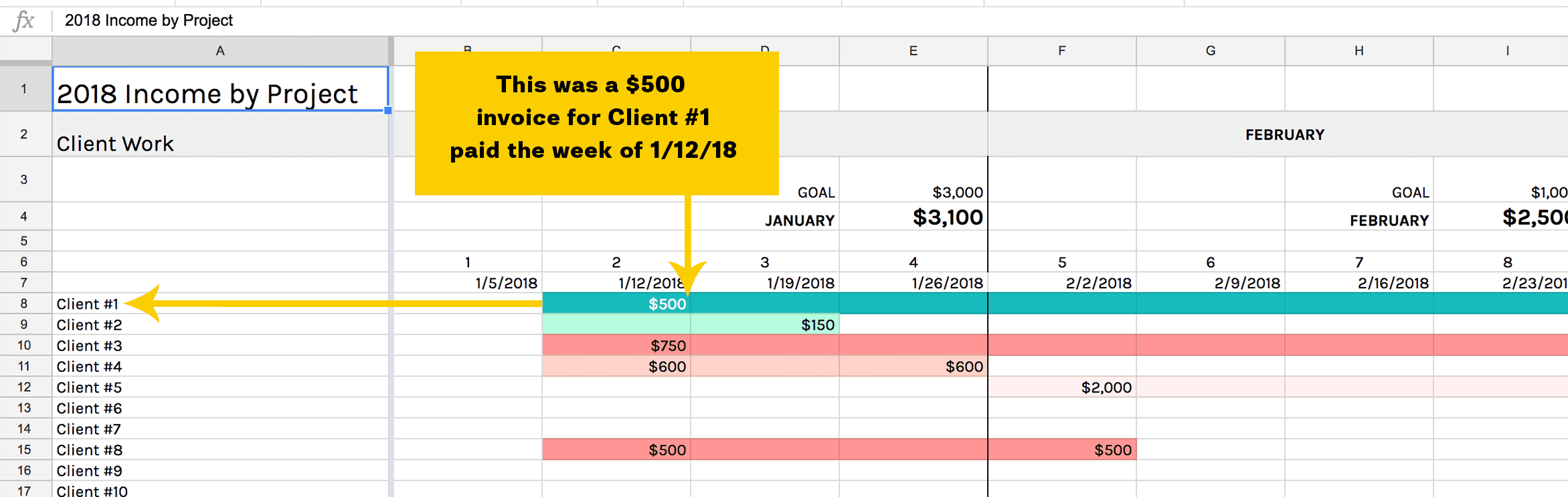 Step 2: Begin updating the spreadsheet with your client projects. List each client project in the top “Client” section. For each client row, you can color in the corresponding cells for the amount of weeks you spent working on the project. This method is especially helpful on an ongoing basis so you can see how many projects you’re working on at one time and your cashflow of when to expect each invoice coming in.