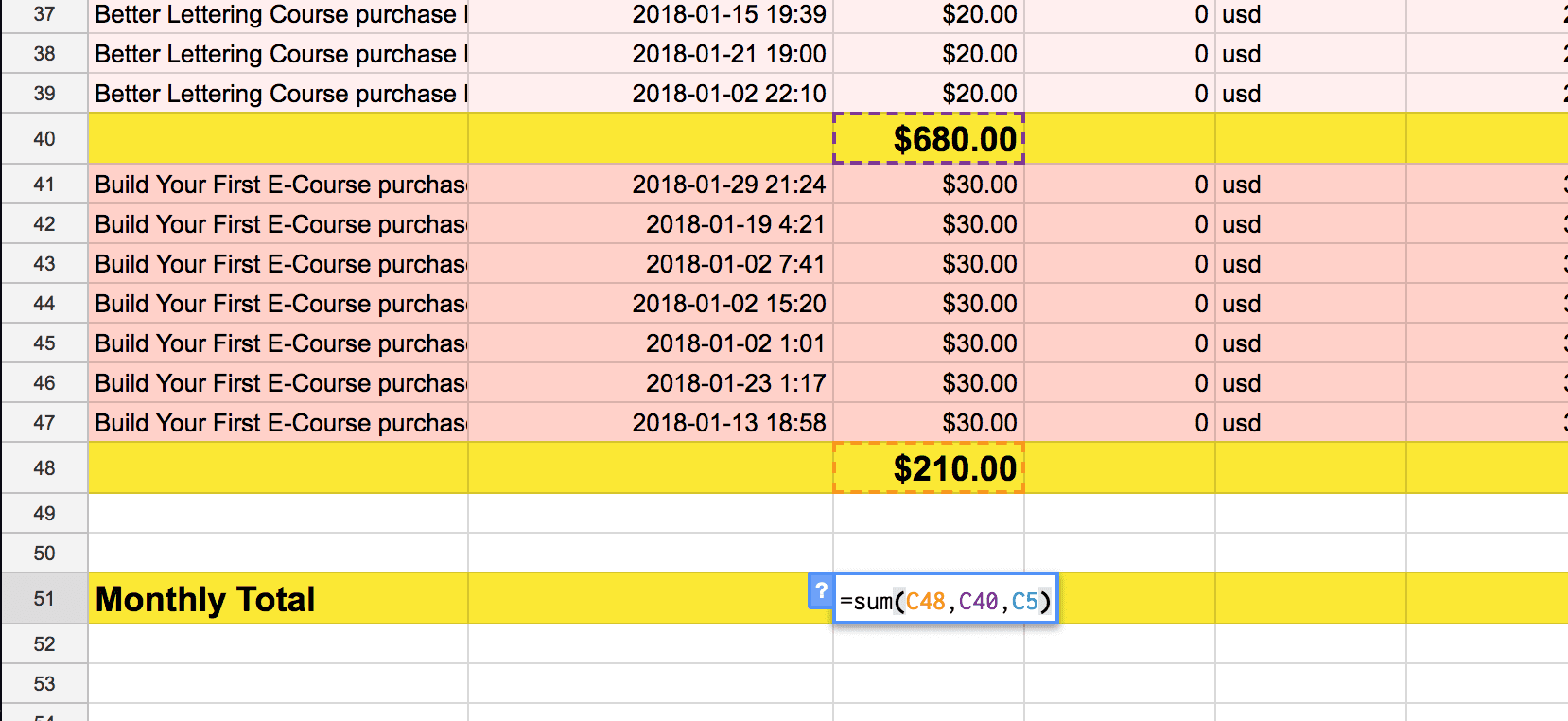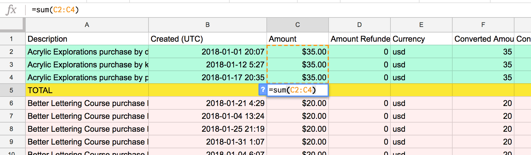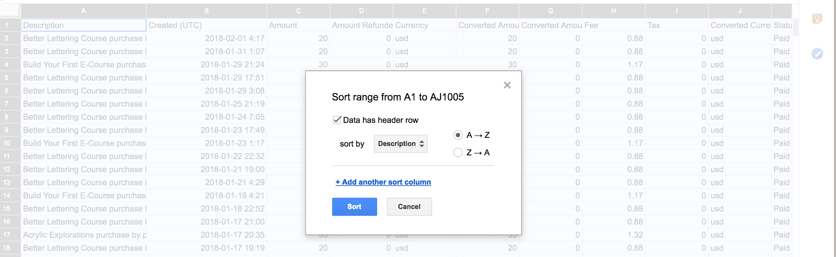 Sort your transactions so you can organize them together by digital product. For example, based on the CSV data, the sort by the “description” column worked well because that would group transactions for the same course together.