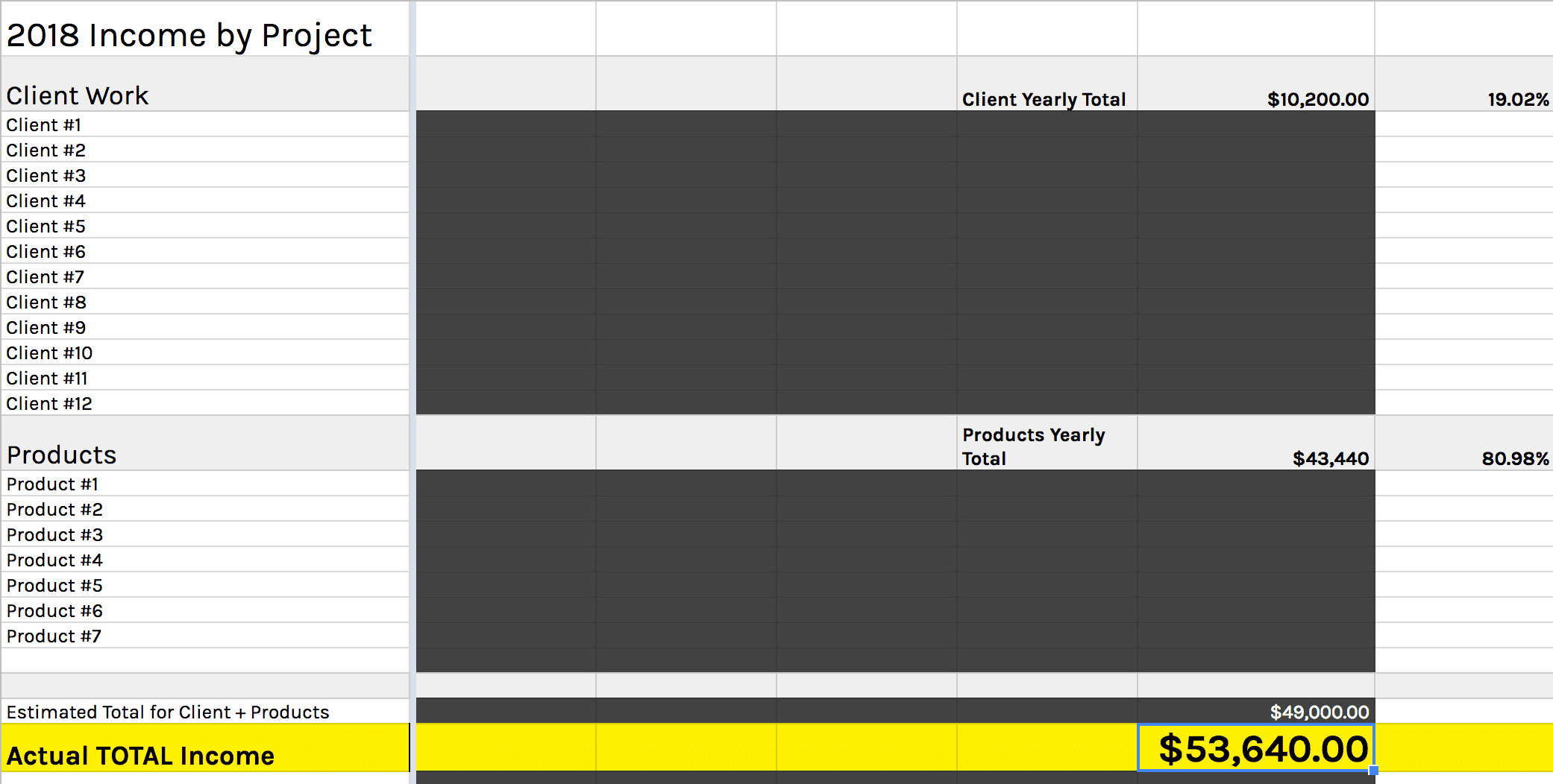Once you have all your various income and projects inputted, you should be able to see how much you’ve made by month, by project/product, and what percentage of your income has come from client work vs. products.