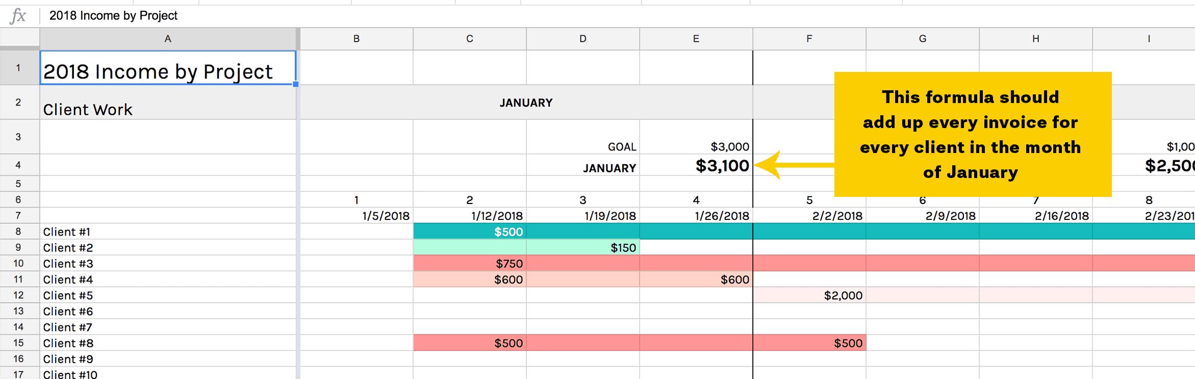Step 4: The sheet should use formulas to automatically add up the invoice totals for each month from each client so you can see how much you made in total client/project income for each month.