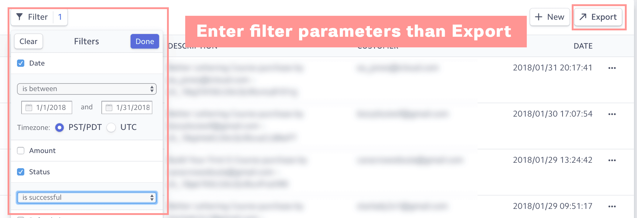 Below is an example using data from Stripe. Under the Payments area, set your filter parameters and then Export your data: