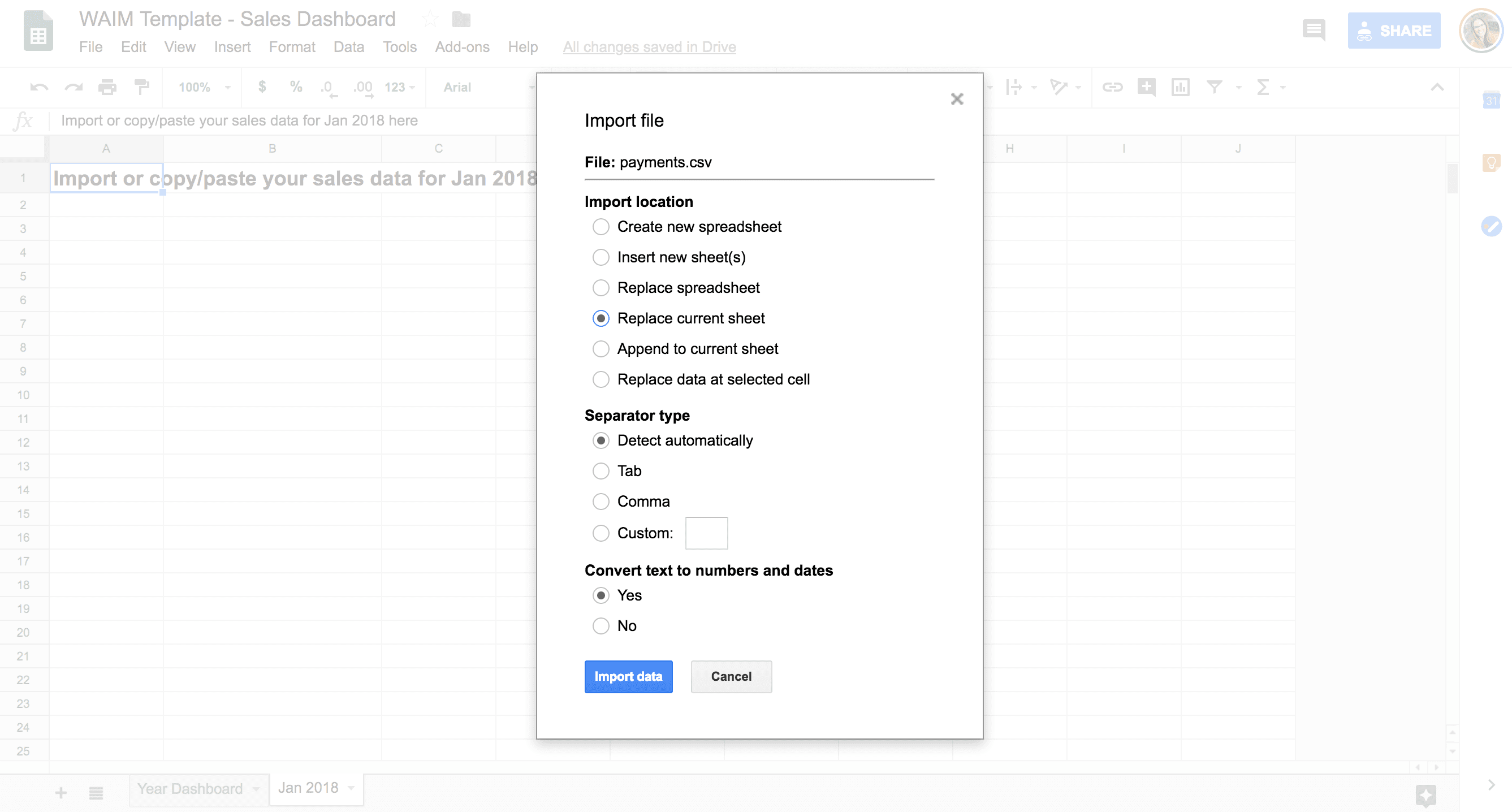 Step 3: Import CSV into your Sales Dashboard Sheet