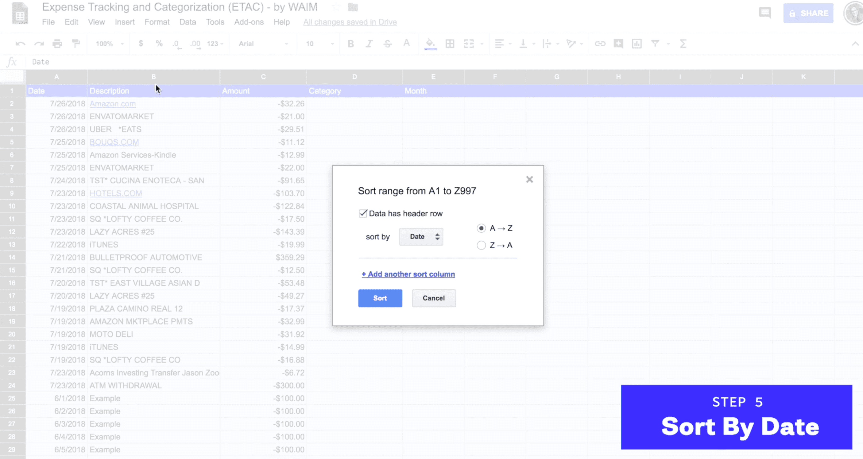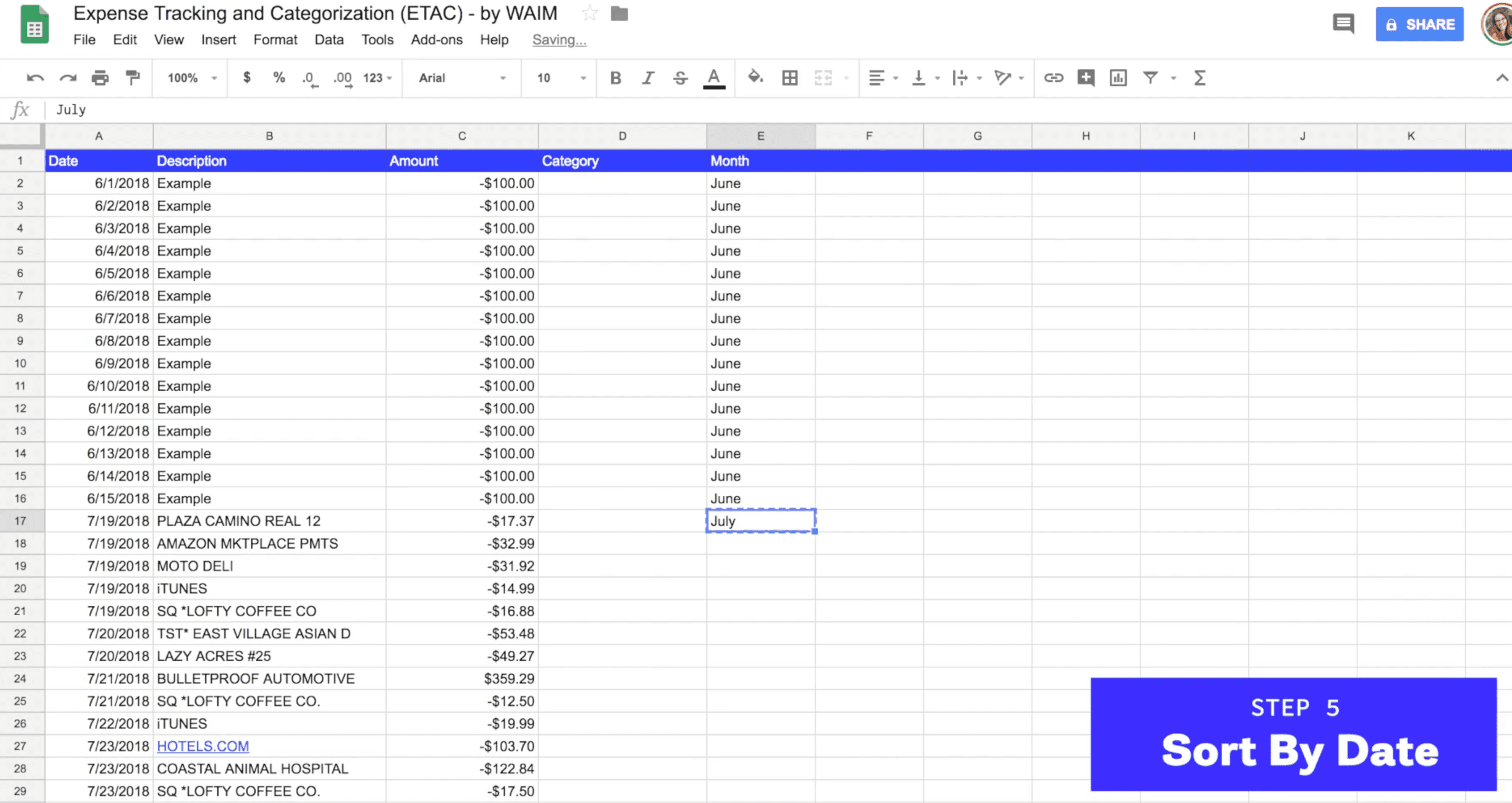 When every transaction has been pasted over to the Expense Tracking tab, sort by date and then fill out the appropriate “Month” column. (This will make it easier to filter your data and see transactions by month.)