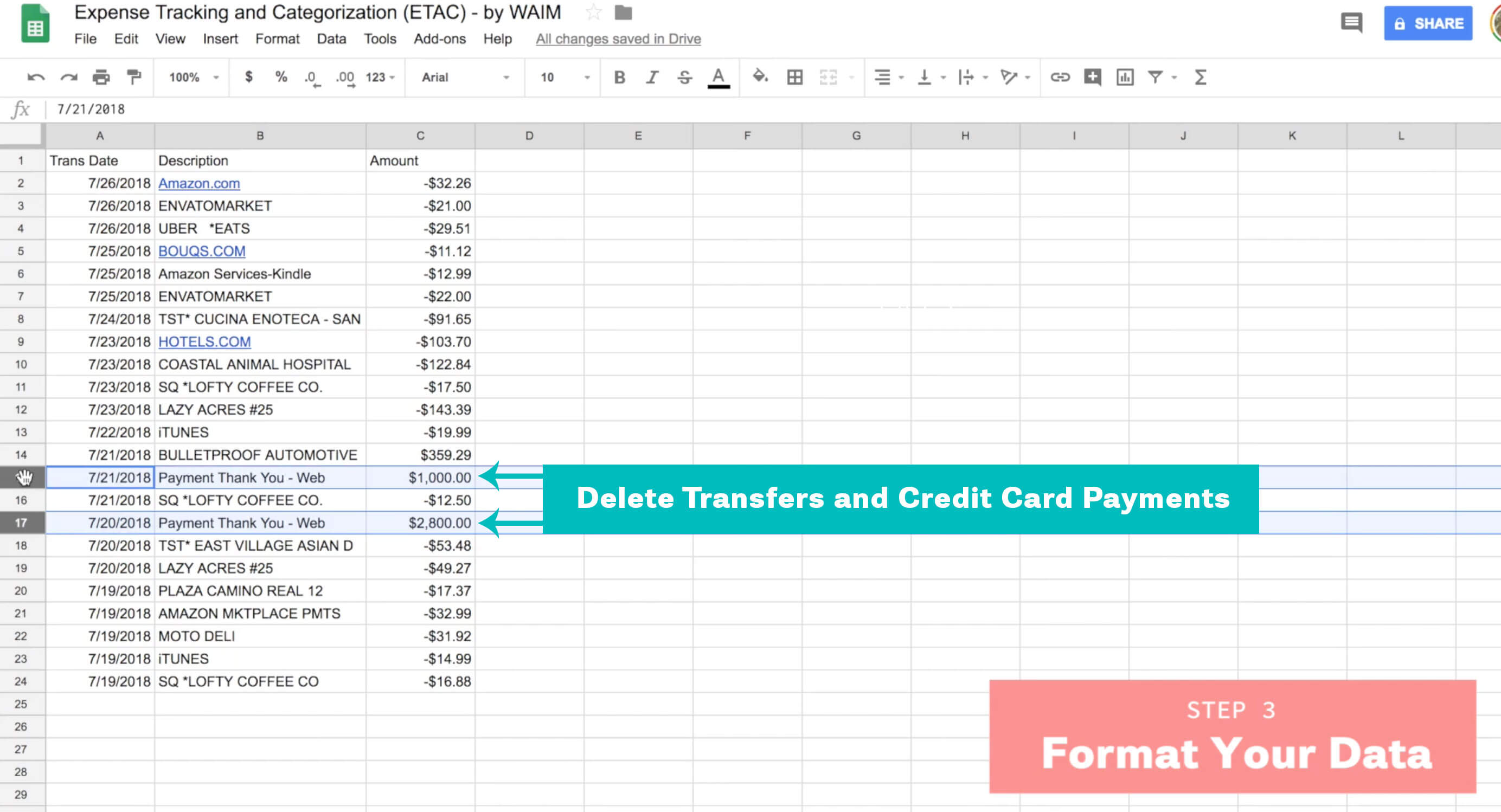Also, delete any transfers or credit card payments. We’re just looking for how much money went out the door, not how much was moved around between accounts. It’s REALLY important you remove these across every tab or else, again, your totals will cancel out and be substantially off.