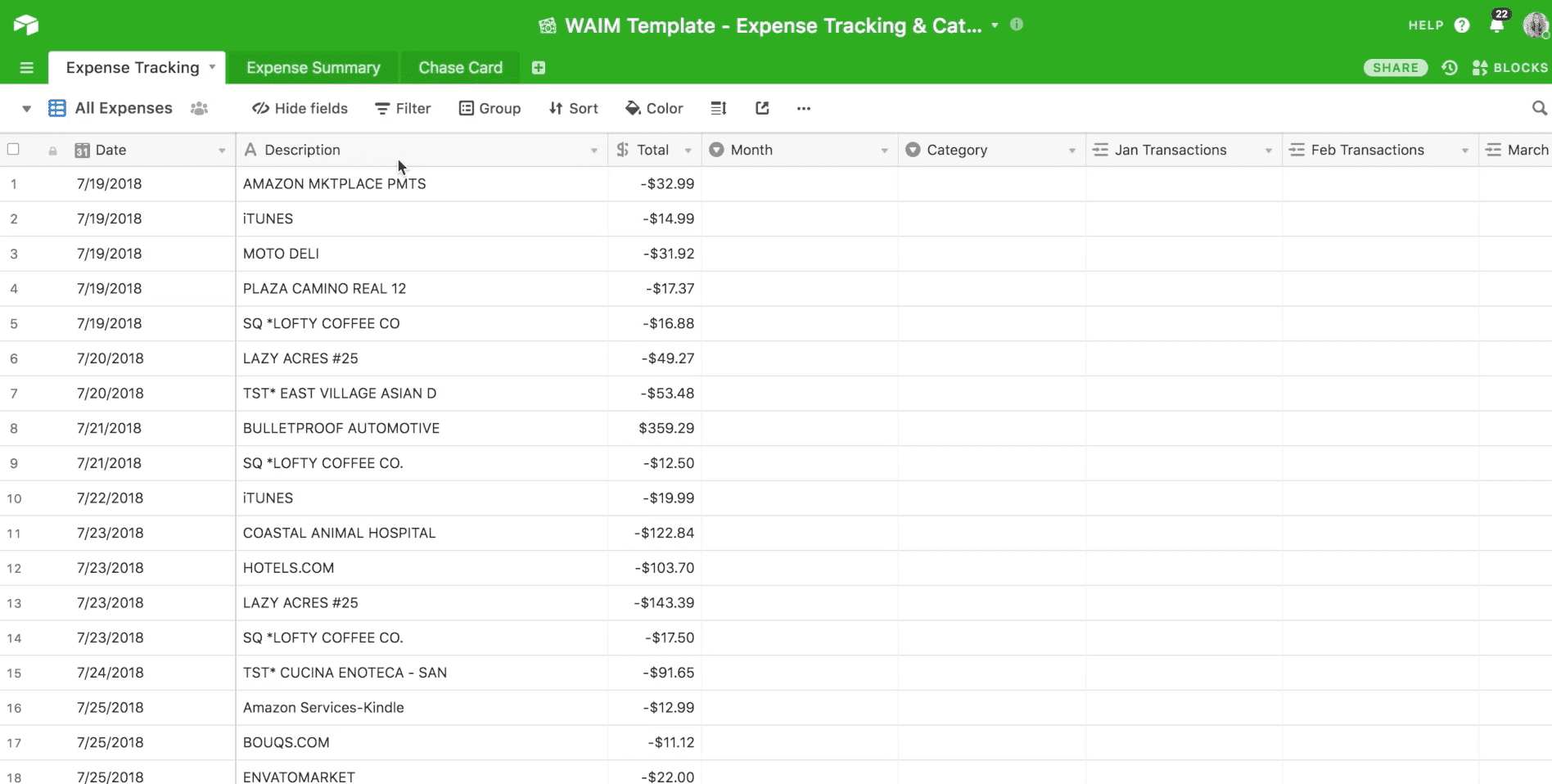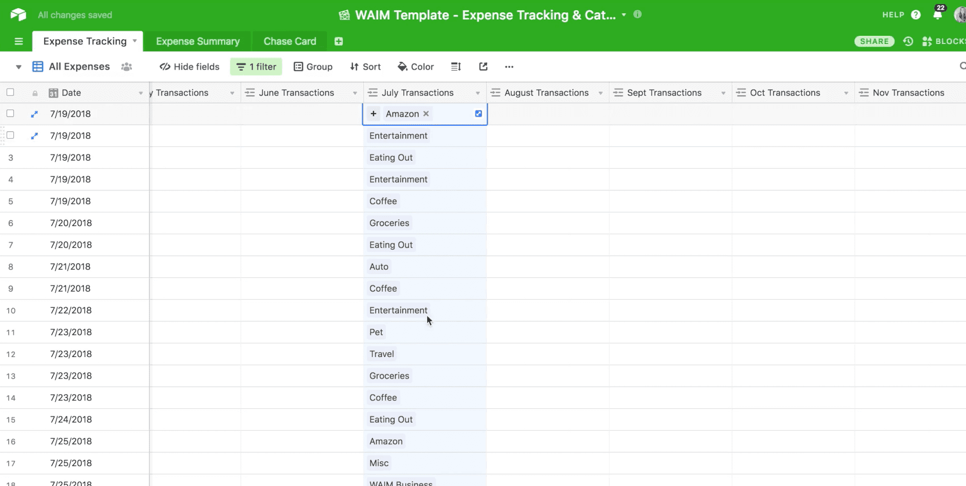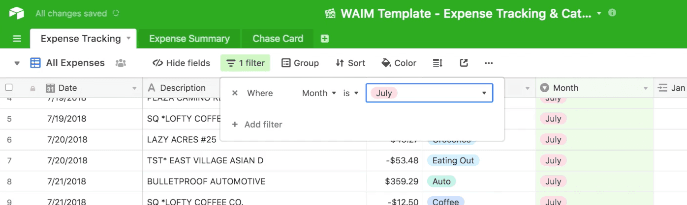 Once your data is all formatted uniformly, copy/paste each list of transactions into the Expense Tracking tab under the All Expenses view.