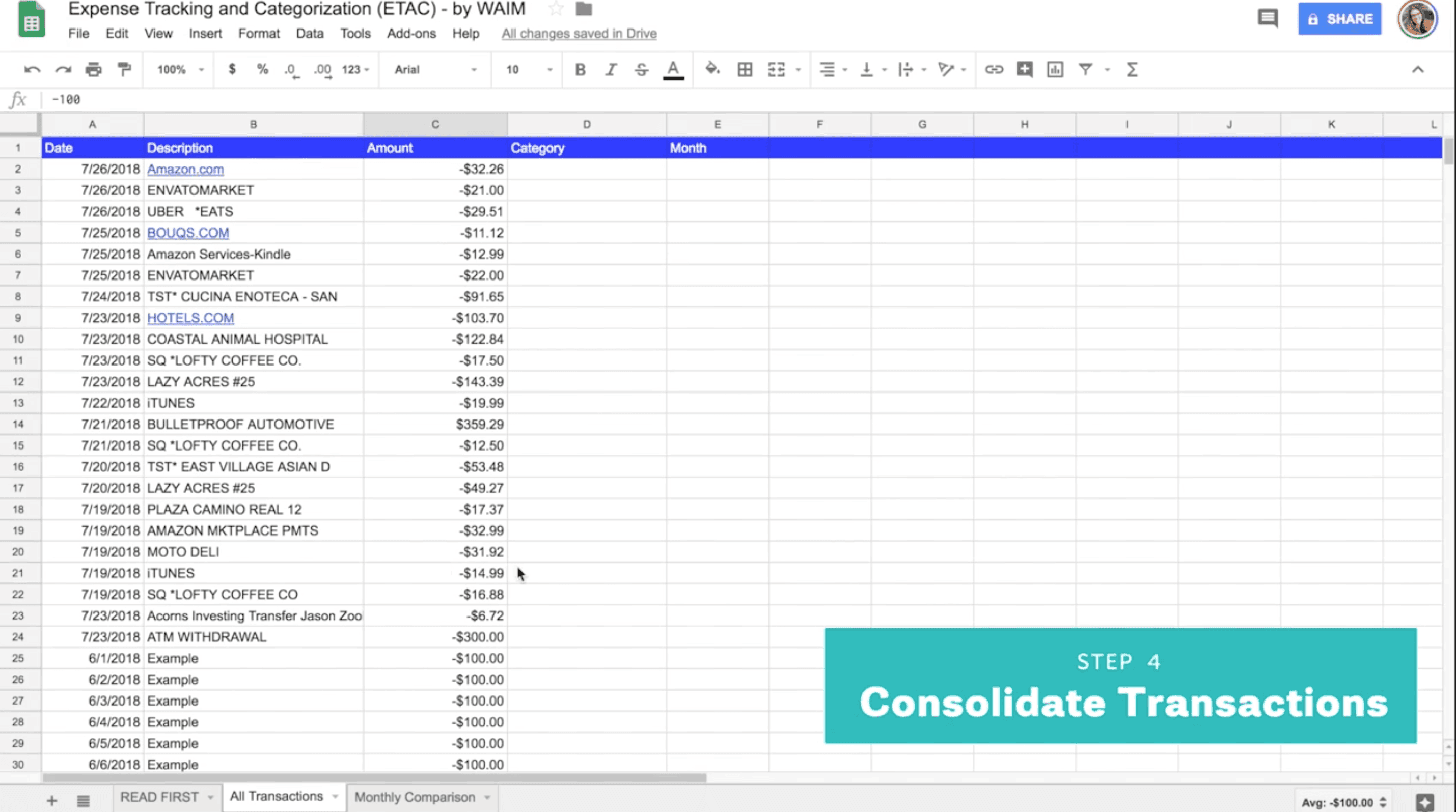 Once the data in all of your tabs is formatted uniformly, copy/paste each list of transactions into one sheet, the sheet in this spreadsheet labeled “All Transactions.”