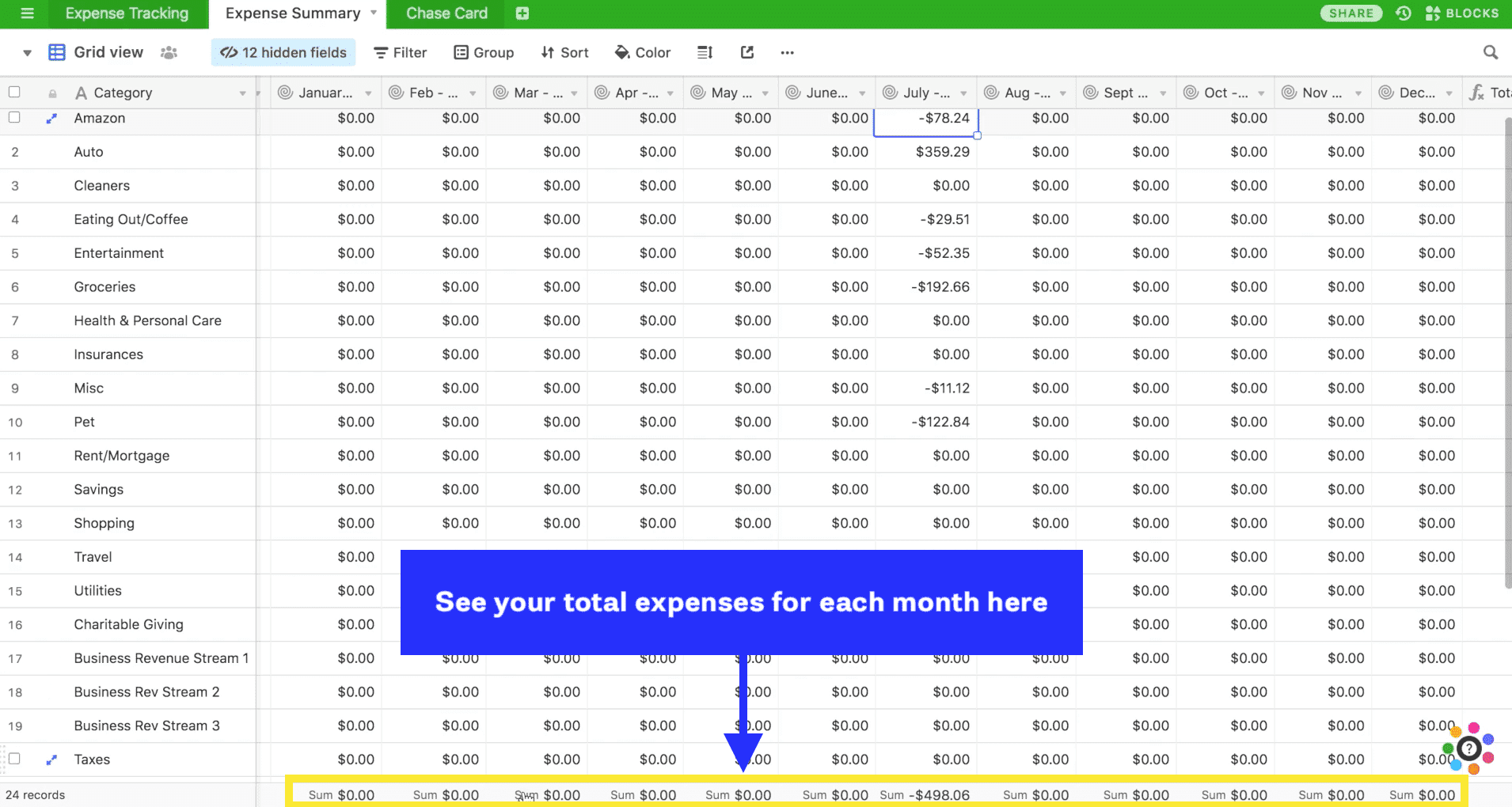 The “July Transactions” field is linked to the Expense Summary tab, so if you go to the Expense Summary, you’ll now see the total spent on each category in the July column.