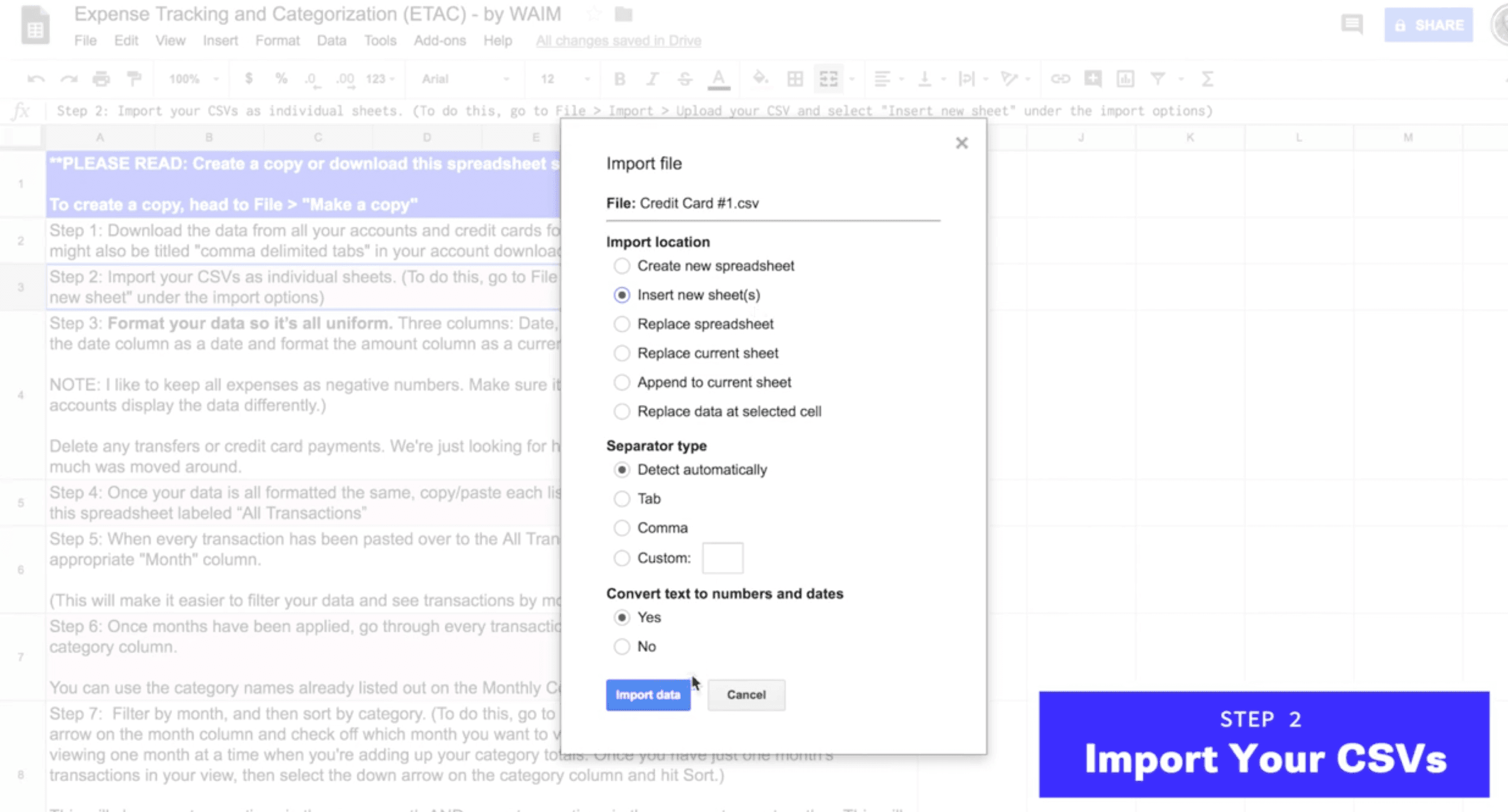 The first thing you'll want to do is make a copy of the Expense Tracking and Categorization (ETAC) Google Sheets for yourself (File > Make a copy).