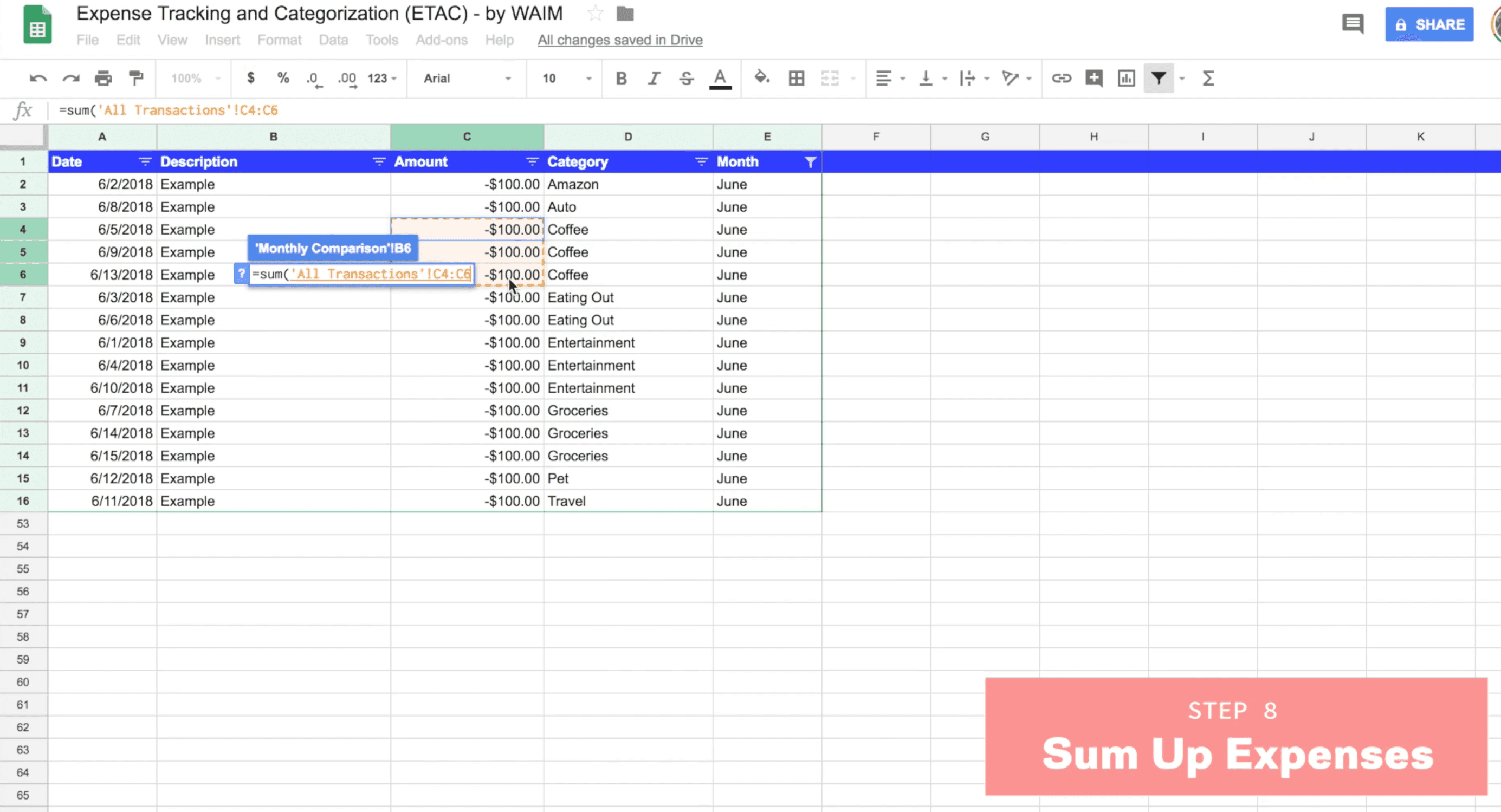 Now that you have transactions for one month only, grouped by category, you can head over to the Monthly Comparison sheet, and use the SUM formula to add up the total for each category within that month.