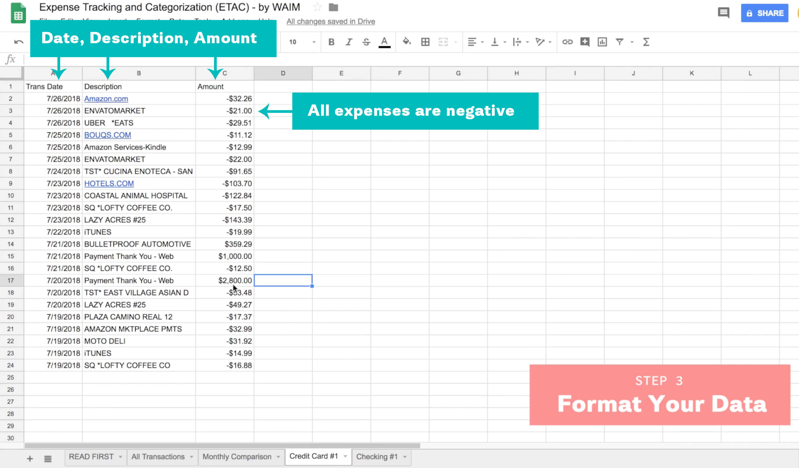 NOTE: We like to keep all expenses as negative numbers. Make sure it’s consistently negative OR positive across every debit or credit account you have because if not, your transactions may cancel each other out giving you an inaccurate total. Whether it was paid for on a credit card or with a debit card, if it was an expense (money going out) I make sure it’s formatted as a negative number.